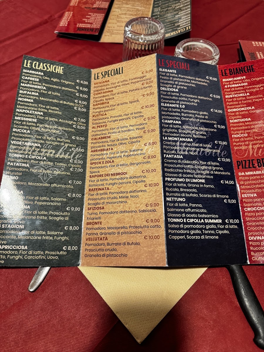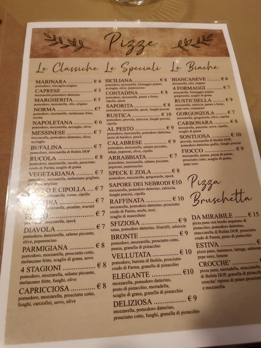The menu at Pizzeria Trattoria Da Mirabile feels like a confident summary of Sicilian comfort food, balancing simplicity with well-chosen flavor combinations. Starters such as Patatine Fritte, Misto Fritto, and Pizzeria Crocchè set a casual, satisfying tone, offering crispy textures that pair naturally with a cold Birra Dello Stretto or a classic Bier. The pizza selection is clearly the heart of the menu, ranging from traditional to more refined options. Classic choices like Pizza Margherita, Pizza Diavola, Pizza Calabrese, Pizza 4 Stagioni, and Pizza Caprichosa deliver familiar flavors, while combinations such as Pizza Con Melanzane E Zucchine and Pizza Bruschetta highlight the kitchen’s focus on fresh vegetables. Seafood and gourmet influences appear in pizzas like Pizza Con Salmone, Pizza Mit Lachs Frisch Käse Und Balsamico, Pizza Elegante, and Pizza Raffinata, offering richer, more nuanced profiles. Meat lovers are well served with options such as Pizza Speck E Zola and Pizza Mortadela Y Pistachio, where savory notes are balanced by creamy or nutty accents. Beyond pizza, Pasta Alla Norma stands out as a strong nod to Sicilian tradition, providing a comforting alternative to the oven-baked dishes. Desserts bring the meal to a satisfying close, from the indulgent chocolate core of Tartufo Al Cioccolato to the smooth sweetness of Panna Cotta Al Caramello and the nutty depth of Plan Al Pistacchio. Altogether, the menu feels cohesive and well-rounded, offering enough variety to appeal to different tastes while staying true to its Italian roots.